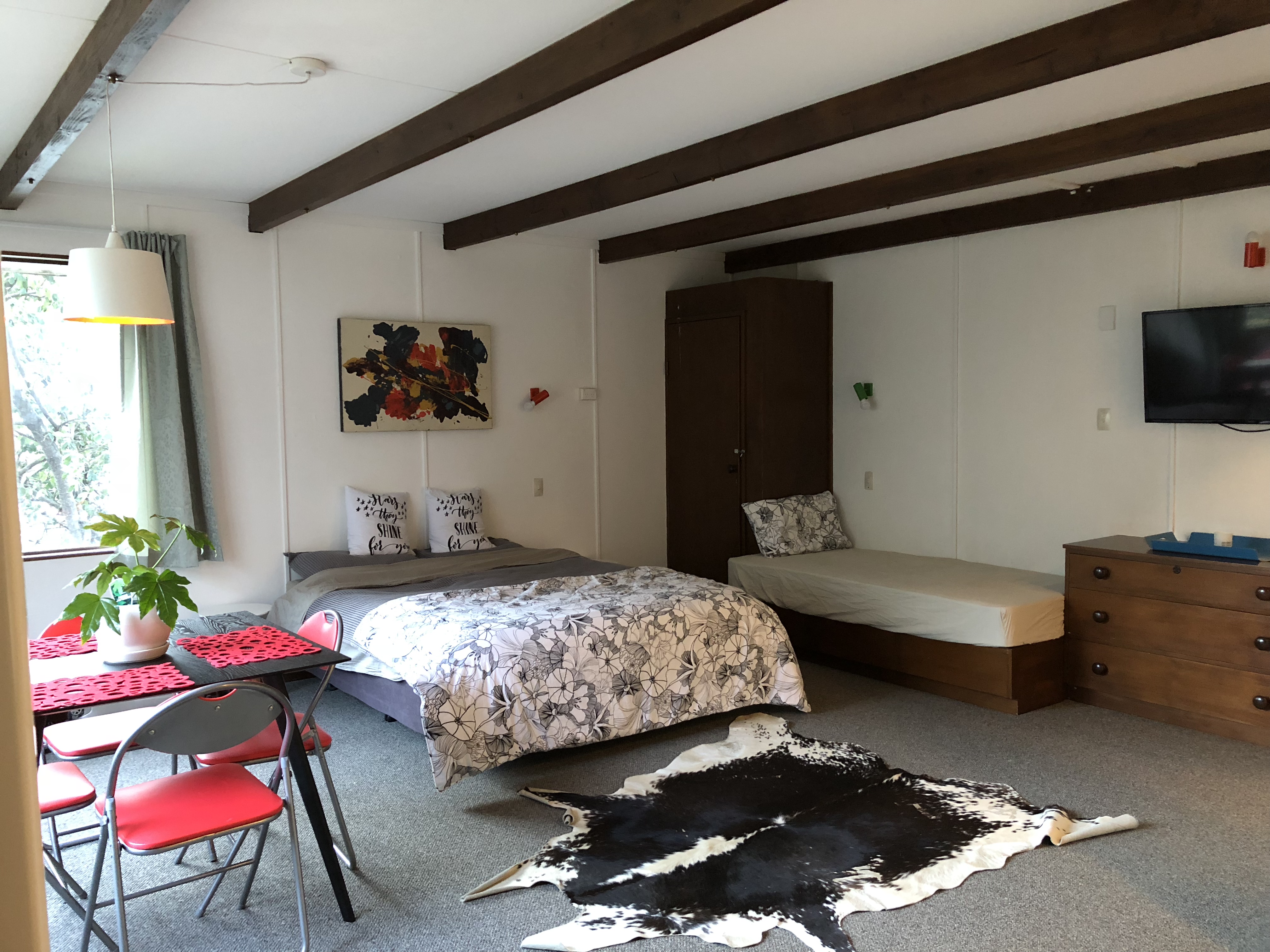 Our quirky 2 person cabins are a newly built unit with a large fully opening window and glass sliding door. The room comes with bed, bedding, table, chair and cupboard. You will have your own deck looking out towards Mt Ben Lomond with views of Queenstown Hill and Cecil Peak across lake Wakatipu. They have insulated walls and each come with a panel heater.
